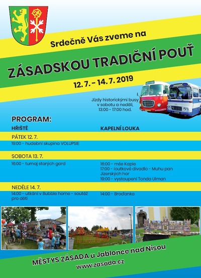 Městys Zásada pořádá o víkendu 12. až 14. července tradiční pouť. Kromě pouťových atrakcí oživí akci fotbalový turnaj starých gard, hudební vystoupení nebo projížďky historickými autobusy, které budou zdarma jezdit mezi fotbalovým hřištěm a náměstím v sobotu i v neděli od 13 do 17 hodin.