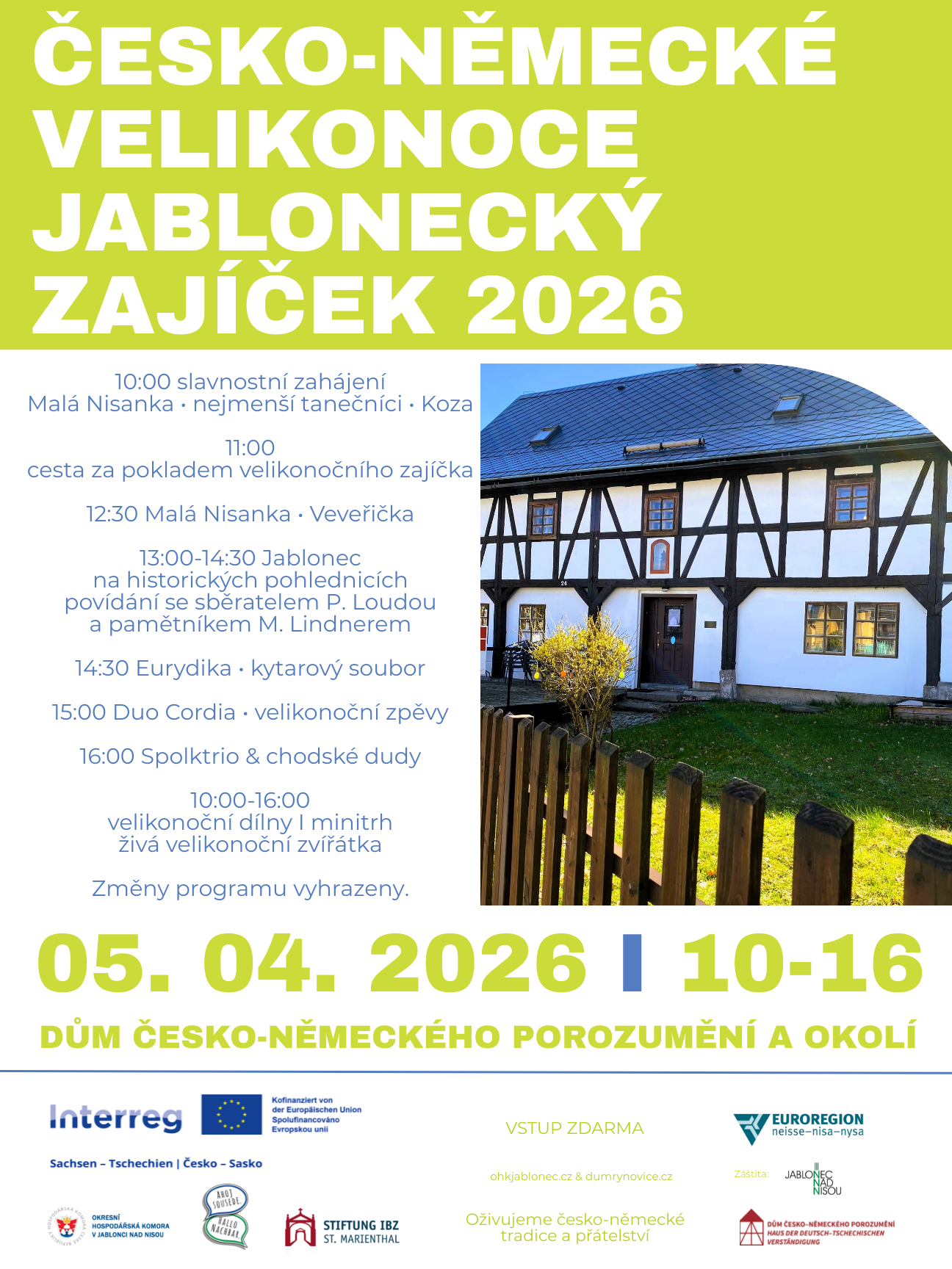 Um an die gemeinsamen Traditionen der Osterzeit zu erinnern, organisieren wir für die breite Öffentlichkeit auf beiden Seiten der Grenze die Veranstaltung „Jablonecký Zajíček 2026" (Deutsch-tschechische Ostern der Gablonzer Hase 2026). Die Veranstaltung findet am Ostersonntag, dem 5.4.2026, in Reinowitz bei Jablonec in der Nähe des Hauses der tschechisch-deutschen Verständigung statt. Freuen Sie sich auf einen kleinen Ostermarkt mit regionalem Kunsthandwerk (regionale Hersteller und Verkäufer von beiden Seiten der Grenze, einschließlich Vorführungen der Herstellung der angebotenen Produkte), Musik- und Tanzaufführungen von Ensembles und Künstlern aus der Grenzregion zum Thema Ostern und lokale Traditionen, tschechische und deutsche Traditionen live, Backen von Osterkränzen mit Ostereiern, eine Schatzsuche des Osterhasen, das Flechten von Osterruten, thematische Erzählungen von Experten über die Geschichte der Stadt und der gesamten tschechisch-deutschen Grenzregion, Vorführungen und Lesungen aus historischen Postkarten, Osterworkshops - Kreativworkshops für Jung und Alt, lebende Ostertiere.