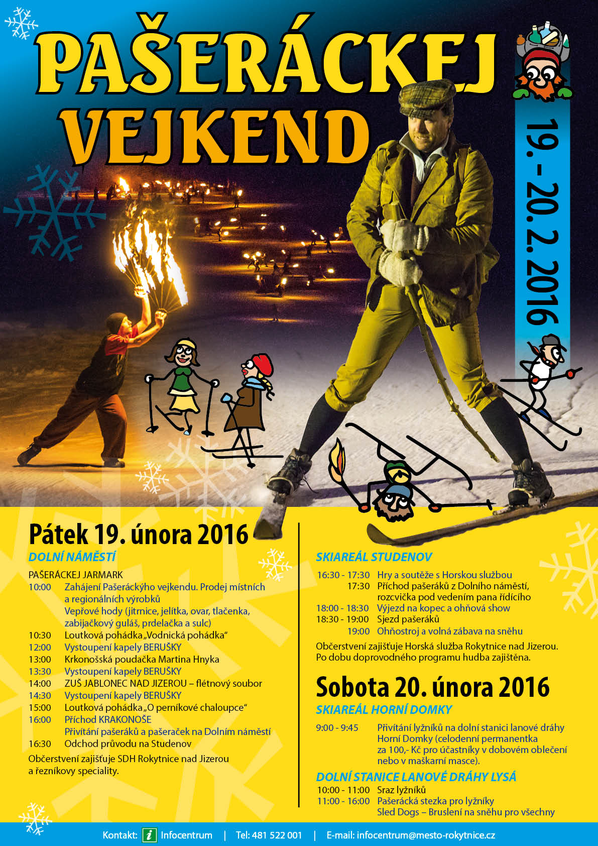 Skiareál Rokytnice nad Jizerou opět po roce přivítá lyžaře v dobových kostýmech a maškarních maskách. Již v pátek 19. února začíná Pašeráckej vejkend, a to zábavnou formou jarmarku a představením na Dolním náměstí. Součástí programu jsou i soutěže a hry s Horskou službou na Studenově, kde proběhne legendární sjezd pašeráků s pochodněmi. Sobota pak bude patřit pašerákům na lyžích, pro něž bude připravena Pašerácká stezka ve skiareálu Horní Domky.