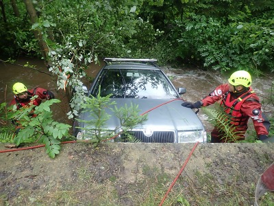 Hasiči vytahovali v Bozkově auto z potoka, řidiče odvezla sanitka