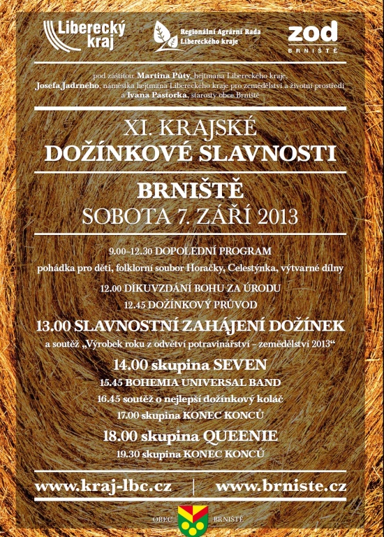 Tradiční Krajské dožínkové slavnosti se letos konají v sobotu 7. září v Brništi. Zábavně kulturní program odstartuje v 9 hodin. Oficiální zahájení spojené s tradičním průvodem se bude konat ve 13 hodin v areálu „Zátiší". V rámci programu budou také vyhlášeny výsledky soutěže Výrobek roku Libereckého kraje z odvětví potravinářství a zemědělství 2013.