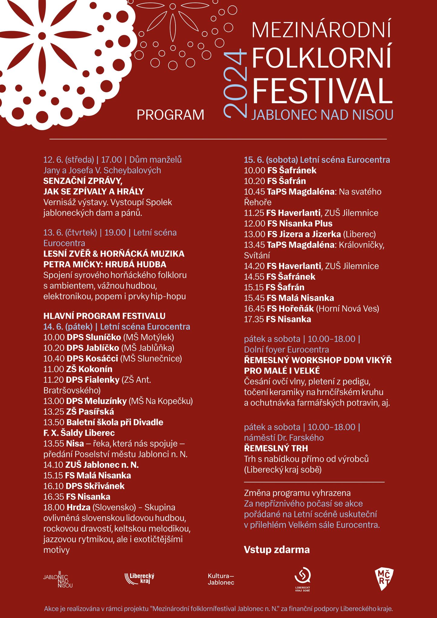 „Festival je událostí pro celou rodinu, která slibuje pestrou přehlídku tradiční hudby, tance, řemesel, zábavy, dobrého jídla a pití. Realizujeme jej v rámci projektu Mezinárodní folklorní festival Jablonec nad Nisou za finanční podpory statutárního města Jablonec nad Nisou a Libereckého kraje. Vstup je zdarma a za nepříznivého počasí se akce uskuteční ve velkém sále Eurocentra," uzavírá za hlavního pořadatele Jakub Gerš, ředitel Kultury Jablonec, p. o. Aktuální program najdete na webu společnosti Kultura Jablonec https://www.kulturajablonec.cz/akce/mezinarodni-folklorni-festival/