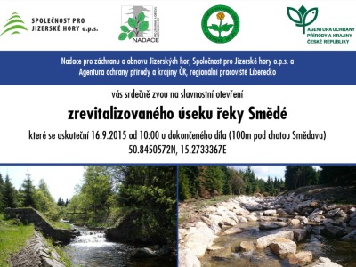 Ve středu 16. září 2015 se v 10 hodin slavnostně otevře za účasti ředitele Agentury ochrany přírody a krajiny ČR Františka Pelce zrevitalizovaný úsek řeky Smědé. Sraz všech zájemců je u dokončeného díla zhruba 100 metrů pod chatou Smědava. Zaparkovat bude možné přímo u chaty na vyznačeném parkovišti. Během slavnostního otevření bude příležitost si nejen prohlédnout současný stav, ale být i při symbolickém vypuštění ryb. Připraveno bude také drobné občerstvení.