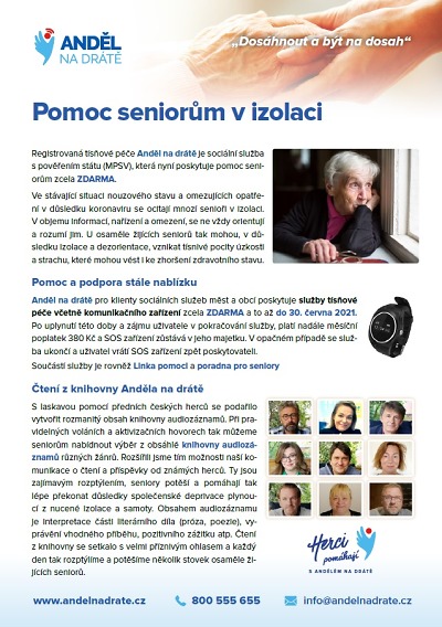 Registrovaná tísňové péče Anděl na drátě je sociální služba s pověřením státu (Ministerstva práce a sociálních věcí), která nyní poskytuje pomoc seniorům zcela zdarma.