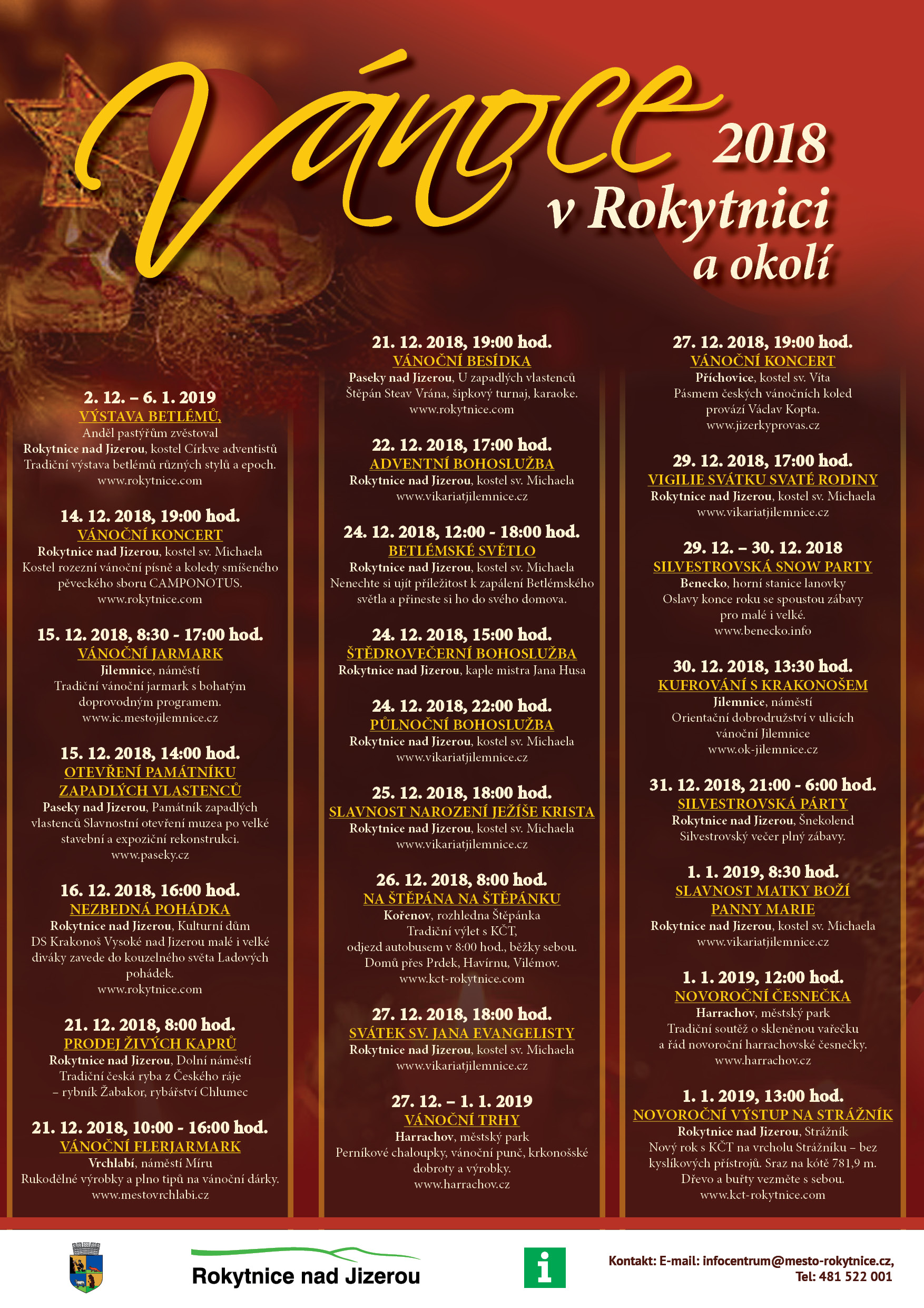 Mnoho adventních akcí se ještě do konce roku koná v Rokytnici nad Jizerou a okolních obcích. Kromě koncertů, bohoslužeb najdete v přehledu i vánoční trhy, snow party nebo novoroční výstupy.
