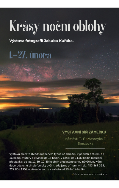 Výstava fotografií Jakuba Kuřáka ve výstavní síni Zámečku. „Výstava Krásy noční oblohy odhaluje příběhy a události ukryté ve fotografiích, které zachycují krásy noční oblohy tak, jak je vidíme my ze Země. Prostřednictvím těchto fotografií si můžeme ukázat nezvyklé úkazy nebo také každodenní oblohu, kterou ve městech nemáme šanci vidět." Výstavu můžete zhlédnout během týdne od 8 hodin, v pondělí a středu do 16 hodin, v úterý a čtvrtek do 15 hodin, v pátek do 11.30 hodin (polední přestávka: po-pá 11.30-12.30 hodin) - před plánovanou návštěvou vám doporučujeme si telefonicky ověřit, zda jsme přítomny (tel.: 483 369 325, 727 806 195), o víkendu pouze v sobotu od 13 do 16 hodin. Podrobná pozvánka
