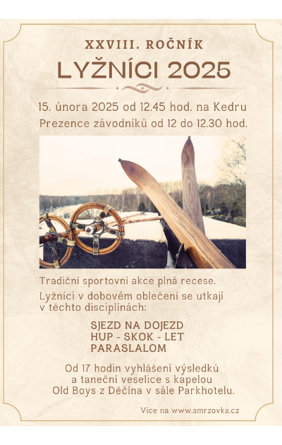 Od 12.45 hodin ve Ski areálu Kedr. (závodníci od 12 do 12.30 hodin prezence). Soutěžit se bude v již tradičních disciplínách: paraslalom, sjezd na dojezd a hup-skok-let. Od 17 hodin taneční veselice a vyhlášení výsledků s Old Boys z Děčína v sále Parkhotelu. V případě nepříznivých klimatických podmínek může dojít ke změně místa konání či zrušení akce. Sledujte webové stránky města - www.smrzovka.cz, kam budou postupně doplňovány informace.