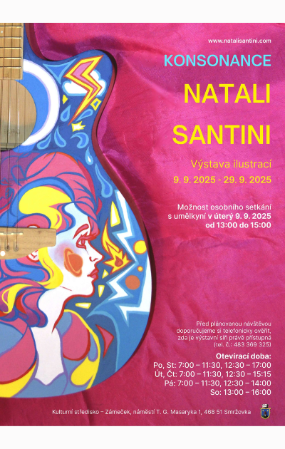 Výstava prací Natali Santini ve výstavní síni Zámečku. V den instalace výstavy 9. září bude možné osobní setkání s umělkyní od 13 do 15 hodin. Malířka a ilustrátorka Natali Santani představuje svou nejnovější výstavu s názvem Konsonance (pozn. red.: souznění, libozvuk, souzvuk) v níž propojuje výtvarné umění s hudbou. Aktuální tvorbu autorky charakterizuje výrazný stylistický posun, který vizuálně navazuje na její úspěšnou výstavní sérii Hvězdná záře. Ta upoutala zájem diváků v různých koutech České republiky. Výstavu můžete zhlédnout během týdne od 8 hodin, v pondělí a středu do 16 hodin, v úterý a čtvrtek do 15 hodin, v pátek do 11.30 hodin (polední přestávka: po-pá 11.30-12.30 hodin) - před plánovanou návštěvou vám doporučujeme si telefonicky ověřit, zda jsme přítomny (tel.: 483 369 325, 727 806 195), o víkendu pouze v sobotu od 13 do 16 hodin. Podrobná pozvánka