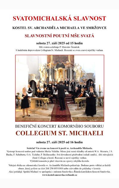 Od 15 hodin v kostele sv. Archanděla Michaela. Součástí je slavnostní mše svatá k poctě sv. Archanděla Michaela, kterou celebruje P. Miroslav Šimáček s hudebním doprovodem komorního souboru Collegium St. Michaeli. Miroslav Šimáček se stal 15. července duchovním správcem farního obvodu Tanvald. V letech 1979-2000 působil v Kořenově - Příchovicích a byl zakladatelem prvního centra mládeže IDCŽM Křižovatka Příchovice. V letech 2000-2010 byl biskupským vikářem litoměřické diecéze a od roku 2002 působil jako arciděkan v Ústí nad Labem. Zároveň před mší bude slyšet hlas zvonu kostela. Od 16 hodin zazní skladby J. S. Bacha, W. A. Mozarta, P. Baldassariho, O. A. Tichého, K. Kudra a dalších. Následovat bude tradiční pohoštění s pouťovými koláčky, možnost komentované prohlídky kostela. V rámci pokračující restaurátorské rekonstrukci varhan (dílčí etapy 1.28-1.35, 2025-2026) se bude dále pracovat na rozeznění mohutného basového rejstříku pro Pedal - Subbas 16´. Podrobná pozvánka