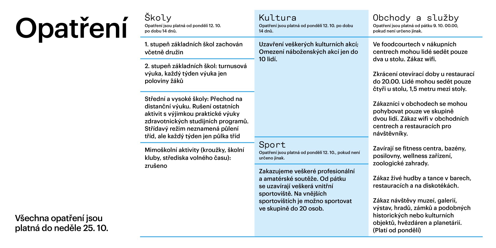 Schválená krizová opatření mimo jiné znamenají, že od půlnoci 9. října se nově zakazuje provoz heren a kasín, provoz a používání vnitřních sportovišť (s výjimkou tělocviku na prvním stupni základních škol), provoz umělých koupališť a veškerých wellness zařízení, pokud se nejedná o zdravotní služby a také návštěvy a prohlídky zoologických zahrad a veškeré organizované zájmové, rekreační a další kroužky pro děti od šesti do 18 let.