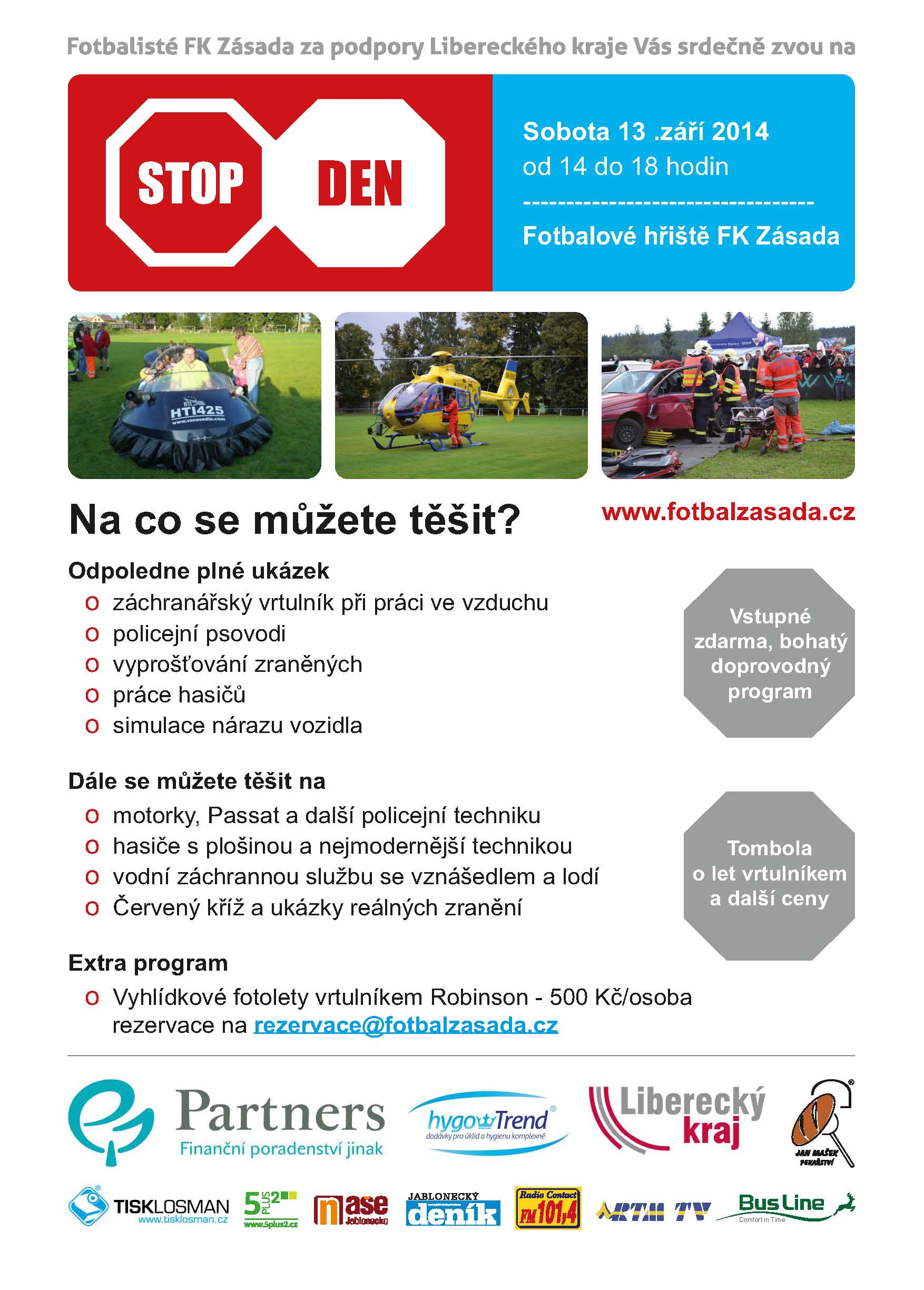 Tedy pokud ještě nemáte na sobotu 13. září žádné plány, zajeďte se podívat do Zásady do areálu fotbalového hřiště. Srdečně vás zvou pořadatelé. „Pevně věříme, že si každý návštěvník najde to své a především pro děti zde bude řada zajímavých informací a akce tak splní svůj účel, a tím je výchova k bezpečnějšímu chování," dodal Princ.