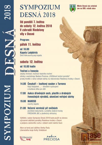 Od pondělí budou dřevosochaři v Desné vytvářet sochy z kmenů stromů, které budou nabídnuty k prodeji v sobotní aukci. Akce vrcholí víkendovým programem, který v pátek navečer - od 18 hodin odstartuje dívčí folk-country-pop kapela Ladybirds. Hlavní program začíná v sobotu 12. května, kdy od 10 hodin budou k vidění ukázky tradičních řemesel, od 14 hodin můžou děti shlédnout divadelní vystoupení loutkového sboru z Turnova - Čmukaři. Hlavním bodem programu je aukce vytvořených soch od 17 hodin. A celé sympozium uzavře od 21 hodin tradiční večerní vernisáž při svíčkách, Fireshow JBC a závěrečný ohňostroj.