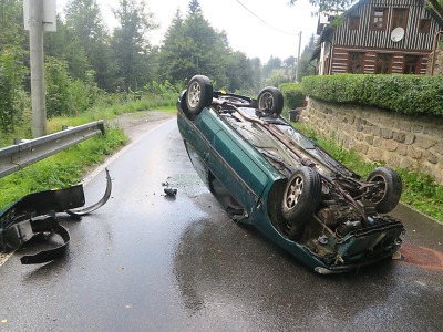 Řidič se zalekl protijedoucího vozidla, strhl řízení, dostal smyk a skončil na střeše. K události došlo v pondělí 16. srpna ve 13.30 v Josefově Dole - Antonínově. Zraněný řidič byl odvezen do nemocnice a škoda je stanovena na 13 tisíc korun.