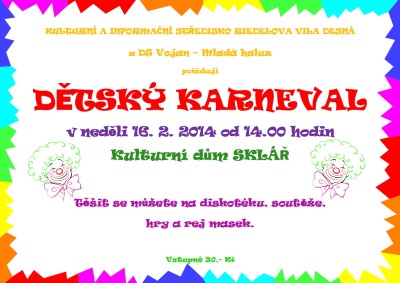 Kulturní a informační středisko Riedelova vila Desná a DS Vojan - Mladá haluz pořádají od 14 hodin v Kulturním domě Sklář v Desné Dětský karneval. Nebude chybět dětská diskotéka, soutěže, hry a rej masek. Vstupné je 30 korun.