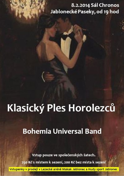 V sále Chronos v Jabloneckých Pasekách proběhne 8. února 3. ročník Klasického plesu horolezců. Jedná se o setkání horolezců, milovníků hor a přírody za doprovodu klasické swingové hudby v podání big bandu Bohemia Universal Band, který bude hrát po celý večer. Ples začíná v sobotu 8. února v 19 hodin, vstup bude možný pouze ve společenských šatech. Ceny vstupenek jsou 250 Kč s místem k sezení, 200 Kč bez místa k sezení. Více podrobností