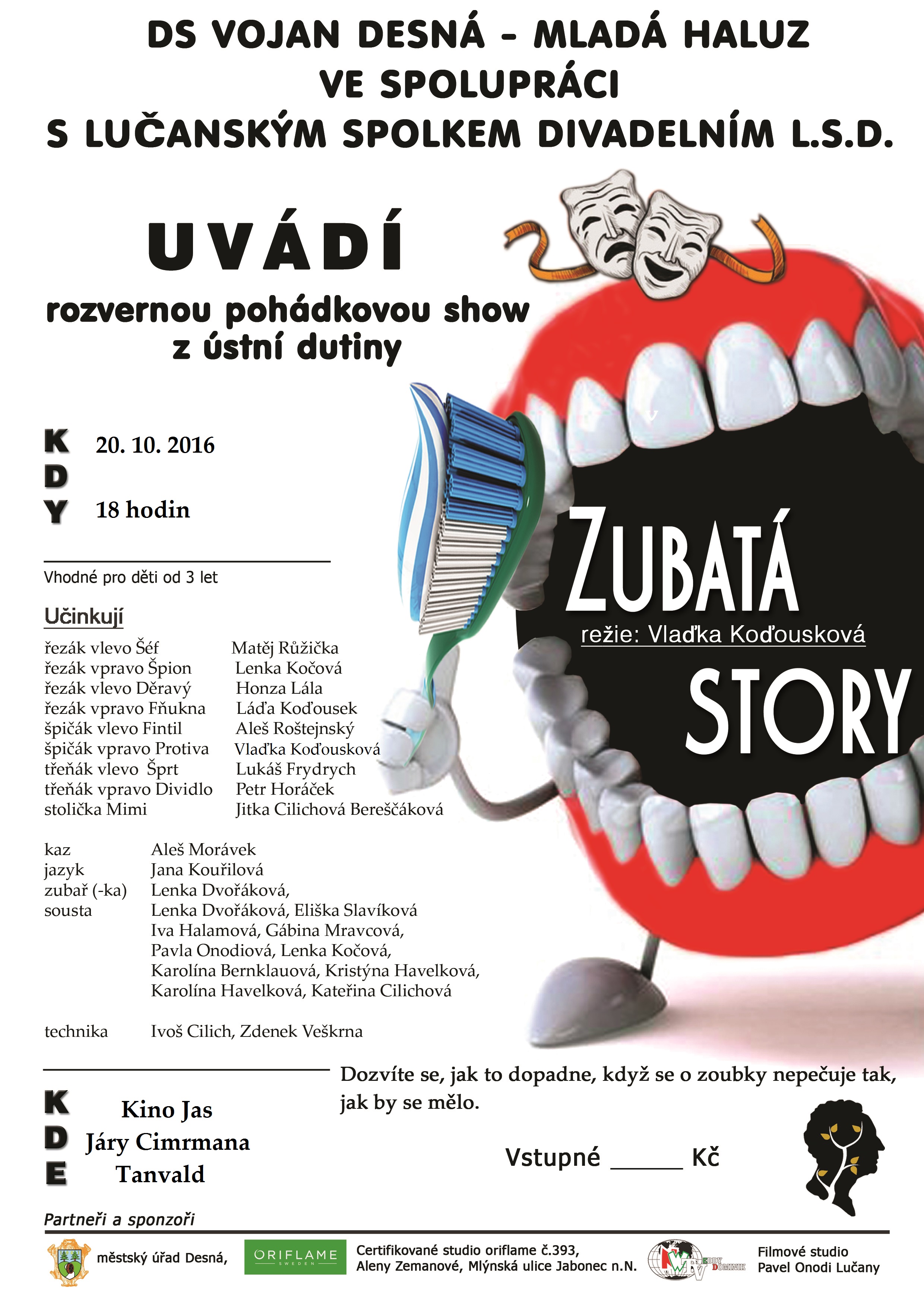 Divadelní pohádkové představení Zubatá story se uskuteční ve čtvrtek 20. října od 18 hodin v kině Jas Járy Cimrmana v Tanvaldě. Hraje DS Vojan Desná - Mladá Haluz ve spolupráci s Lučanským spolkem divadelním L.S.D. a v režii Vlaďky Koďouskové. Vstupné je 30 Kč pro děti a 50 Kč dospělí.